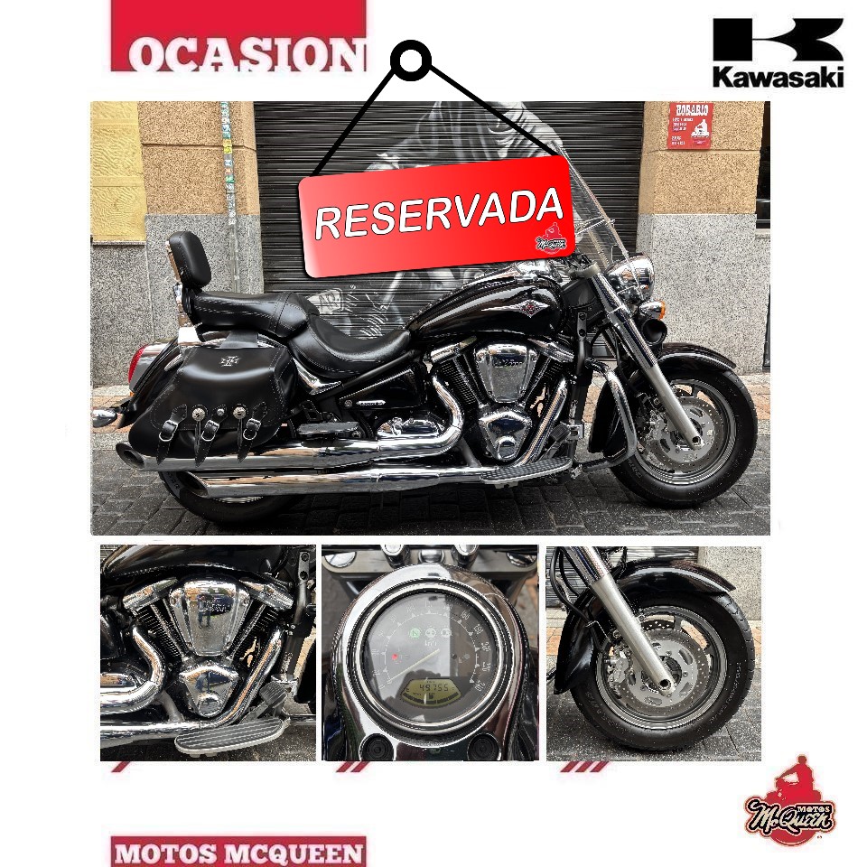 Motocicleta Kawasaki VN 2000 Classic del 2008 con 49.755 km, en muy buen estado. Cuenta con los siguientes extras: defensas, pantalla, respaldo y plataformas del pasajero, puños, rulo, alforjas, corbata del depósito y espejos. Se entrega con revisión hecha en servicio oficial. Etiqueta ambiental C. Garantía de 1 año. Se puede financiar sólo con la nómina, (sujeto a la aprobación del crédito, importe mínimo 1.000€). @Motos McQueen.